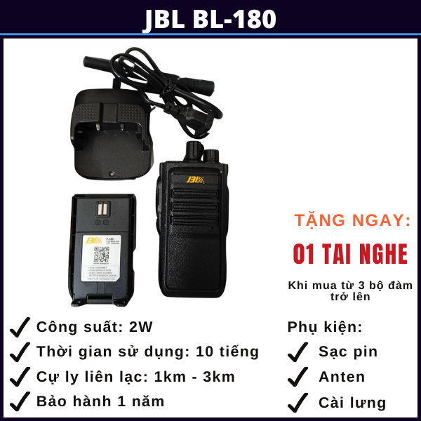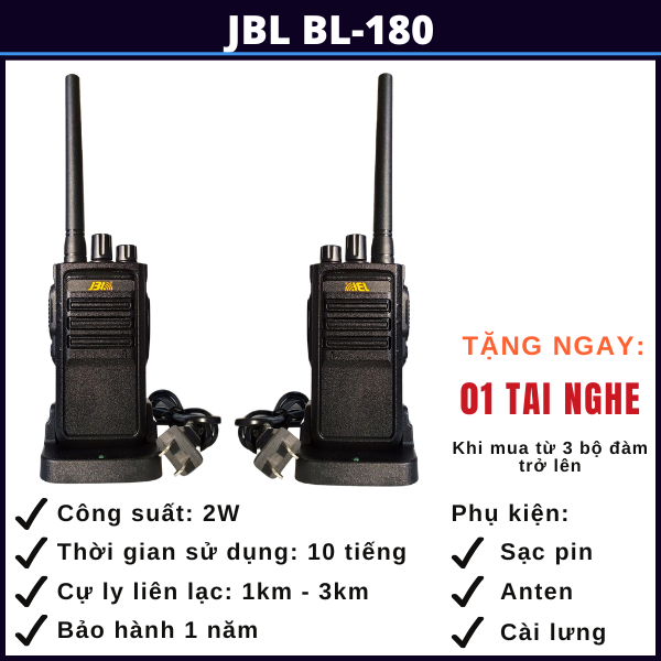 Bộ đàm JBL BL-180 là dòng bộ đàm cầm tay dùng để liên lạc 2 chiều hướng tới đối tượng khách hàng cần bộ đàm giá rẻ với phạm vi làm việc dưới 3km. BL-180 là sự lựa chọn phù hợp cho các tổ chức, cá nhân làm việc trong các lĩnh vực an ninh, bảo vệ tòa nhà, khách sạn, nhà hàng hay các cửa hàng buôn bán nhỏ, quán cafe, quán karaoke,…