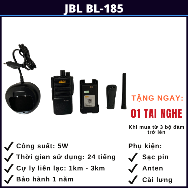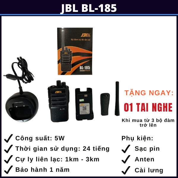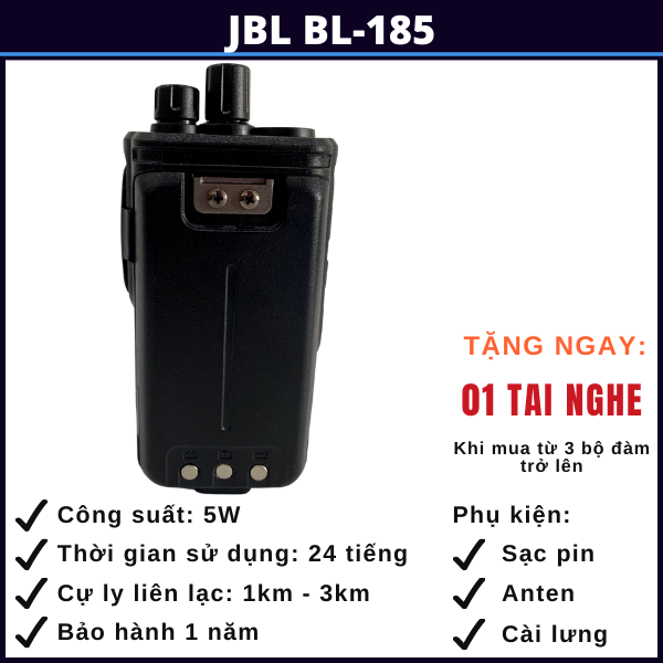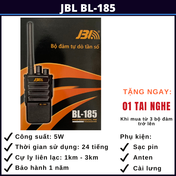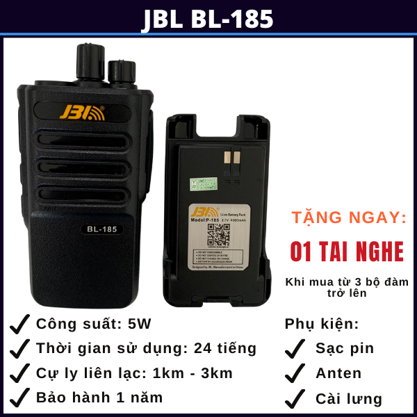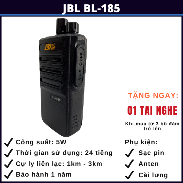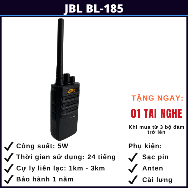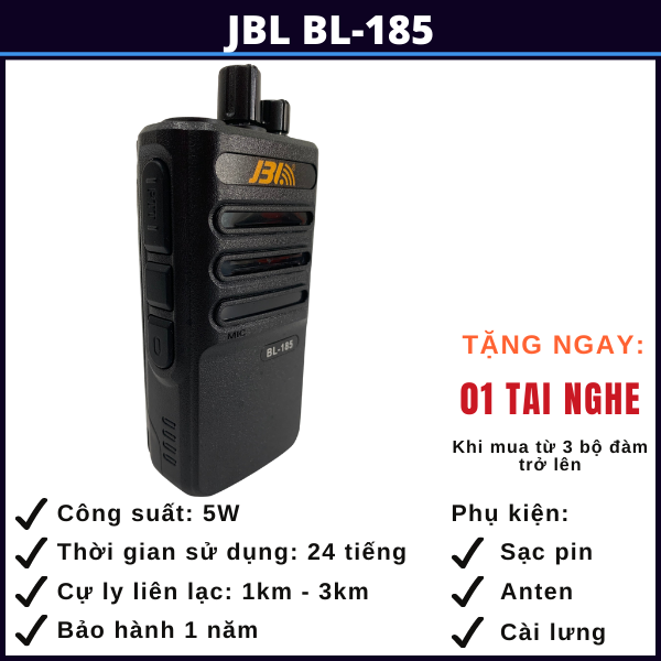 Bộ đàm JBL BL-185 là thiết bị liên lạc 2 chiều sử dụng tần số UHF được sản xuất chính hãng bởi JBL với nhiều ưu điểm nổi bật so với các dòng bộ đàm khác như tính năng tự dò tần số, thời gian sử dụng dài, thiết kế nhỏ gọn và chắc chắn giúp người sử dụng dễ dàng làm việc theo nhóm bằng cách kết nối với các máy bộ đàm có cùng tần số và kênh liên lạc. Người nói chỉ cần bấm và giữ nút PTT để truyền thông tin đến người nghe và bỏ nút PTT khi muốn nghe thông tin từ người đang đàm thoại với mình.