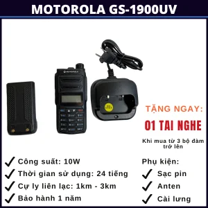 Bộ đàm Motorola GS-1900UV là thiết bị liên lạc 2 chiều tích hợp song song 2 băng tần số UHF, VHF với nhiều ưu điểm nổi bật so với các dòng bộ đàm khác như khả năng truyền phát tín hiệu qua vật cản rất tốt (UHF) hay truyền phát tín hiệu tầm xa trong môi trường trống trải (VHF). Người sử dụng dễ dàng linh hoạt sử dụng dải tần số phù hợp với điều kiện làm việc của mình bằng cách kết nối với các máy bộ đàm có cùng tần số và kênh liên lạc. Người nói chỉ cần bấm và giữ nút PTT để truyền thông tin đến người nghe và bỏ nút PTT khi muốn nghe thông tin từ người đang đàm thoại với mình.