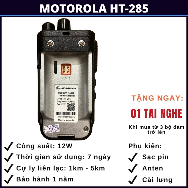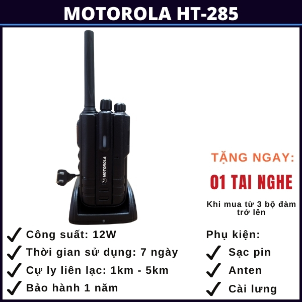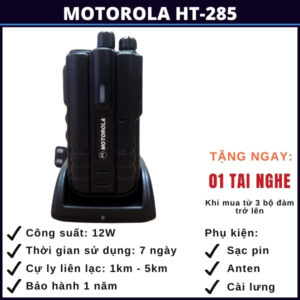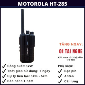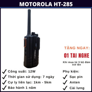 Motorola HT-285 là một trong những sản phẩm máy bộ đàm hàng đầu, được thiết kế để đáp ứng nhu cầu liên lạc trong môi trường công việc chuyên nghiệp. Với tính năng vượt trội, công suất lớn, thiết kế cứng cáp và bền bỉ, thời gian sử dụng pin lớn lên tới 7 ngày, có khả năng tự dò tần số giúp bạn có thể dò tần số và kết nối với những dòng bộ dàm khác không cùng tần số và độ tin cậy cao, HT-285 của Motorola mang lại sự tiện ích và hiệu suất cho các ngành công nghiệp, tổ chức, cho nhu cầu đi rừng đi biển và những chuyến đi phượt.