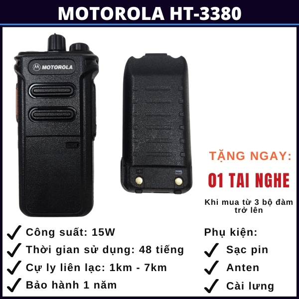 - Thời lượng pin lên đến 2 ngày: Với thời lượng sử dụng pin kéo dài lên đến 2 ngày, Motorola HT-3380 đảm bảo rằng bạn luôn duy trì được liên lạc mà không lo lắng về việc hết pin giữa chừng. Pin dung lượng cao cùng với thiết kế tiết kiệm năng lượng là điểm mạnh lớn của dòng bộ đàm này.