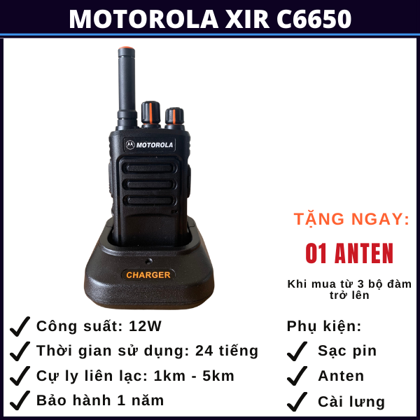 Bộ đàm Motorola Xir C6650 là một trong những sản phẩm hàng đầu trong dòng bộ đàm chuyên nghiệp của Motorola. Được thiết kế để đáp ứng các yêu cầu cao về liên lạc trong môi trường khắc nghiệt, Xir C6650 cung cấp khả năng truyền tải tín hiệu rõ ràng và ổn định ngay cả trong các khu vực khó khăn.